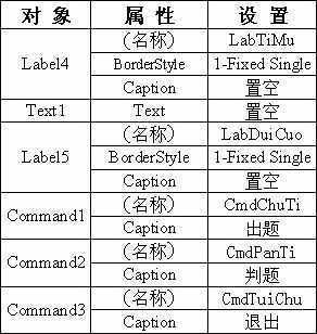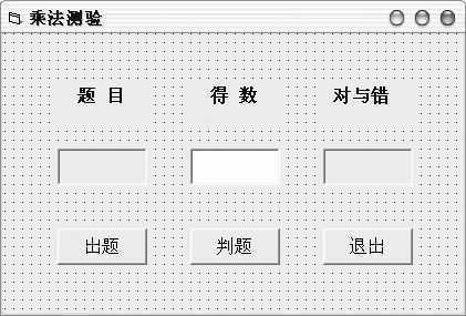 这个实例我们可以用VB6.0来完成。先启动VB6.0,在新建窗体中加入5个Label控件,1个TextBox控件及3个CommandButton控件,调整位置。设置Form1的Caption属性为“乘法测验”,Label1、Label2及Label3的Caption属性分别为“题目”、“得数”和“对与错”,其他属性设置如表1所示, 调整完成后的界面如图1。