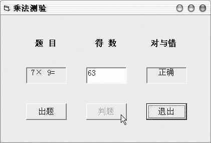 好了,你现在可以按“F5”键运行了。单击“出题”按钮,电脑将随机给出1至9的乘法算式,在文本框中输入答案后,单击“判题”按钮即可判断得数的对错(如图2),很不错吧!当然你也可以将程序界面设计得更加美观实用。看着小侄子在电脑上玩得不亦乐乎,我也乐得忙里偷闲,真是一举两得!