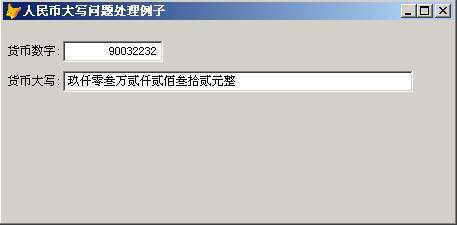 程序运行的效果如图所示。在“货币数字”框中输入数字后,“货币大写”框中立即显示转换结果。