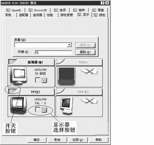 设置显示属性步骤如下(WinXP和Win98SE系统相同,这里以Radeon9100为例):1)进入“显示属性”对话框,按“设置”按钮后选定显示器1,不启用显示器2。2)按“高级”按钮后进入显卡属性对话框,按“显示”按钮进入显示设置对话框(图2)。3)先用鼠标点击电视机“TV(T)”的开关按钮,让它处于打开状态(红色为关闭,绿色为打开);再用鼠标点击显示器选择按钮中左边由两个圆形组成的按钮,选中时按钮应呈 “凹陷”状,接着按“确定”按钮,显示屏幕变小且变得闪动,并弹出“ATi 属性页”对话框,最后按“确定” 按钮,屏幕就处于如低刷新率般的闪动状态。这样我们才可以在播放宽带电影时让录像机开始“下载”。