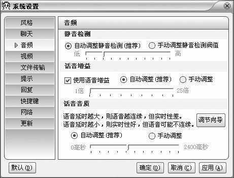 第二步,在打开的窗口左侧单击“音频”,在出现的窗口中就可以对静音检测、话音增益、话音音质进行设置(图2)。比如优化语音效果,可以选中使用语音增益,选中“手动调整”,还可以手动调整增益倍数。