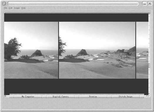 在点击“Stitch Image(缝合图像)”后,软件就会调用PhotoVista强大的引擎对场景照片进行自动接缝,并通过复杂的照片边缘探测和平滑计算方法,将多幅场景照片拼接成无缝的360度全景。