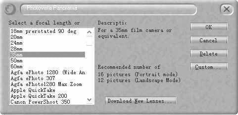 为了获得一个比较好的全景效果,我们要根据所使用的相机在软件中进行镜头参数设置,点击“Images→Select Lens”,在弹出的窗口中选择你的相机品牌和具体参数(图2),如果你使用的是非品牌的普通相机,可以使用默认的35mm,然后点击“Custom”按钮,在弹出的窗口中选择“Fine→tune Settings”,系统会自动根据你的场景照片分析出适当的镜头参数,确定后返回图2窗口点击“OK”后镜头参数设置完成。