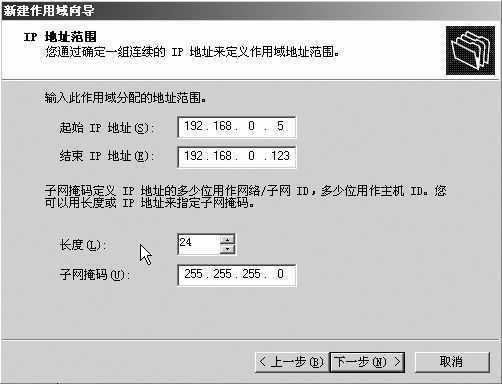 在“新建作用域向导”对话框中点击“下一步”按钮,在“作用域名”对话框中指定该作用域的名称和描述信息后点击“下一步”按钮,然后分配该作用域的IP地址范围(见图),如笔者想把IP地址范围限制在“192.168.0.5~192.168.0.123”地址段。接着定义子网掩码,将“长度”栏中的数值设置为“24”,点击“下一步”按钮后,在“添加排除”对话框中指定作用域中你想排除的IP地址范围,如果没有,直接点击“下一步”按钮即可。最后,配置“租约期限”,在“配置DHCP选项”对话框中一定要选择“是,我想现在配置这些选项”,点击“下一步”按钮后,就可以指定默认网关和DNS服务器配置信息了。