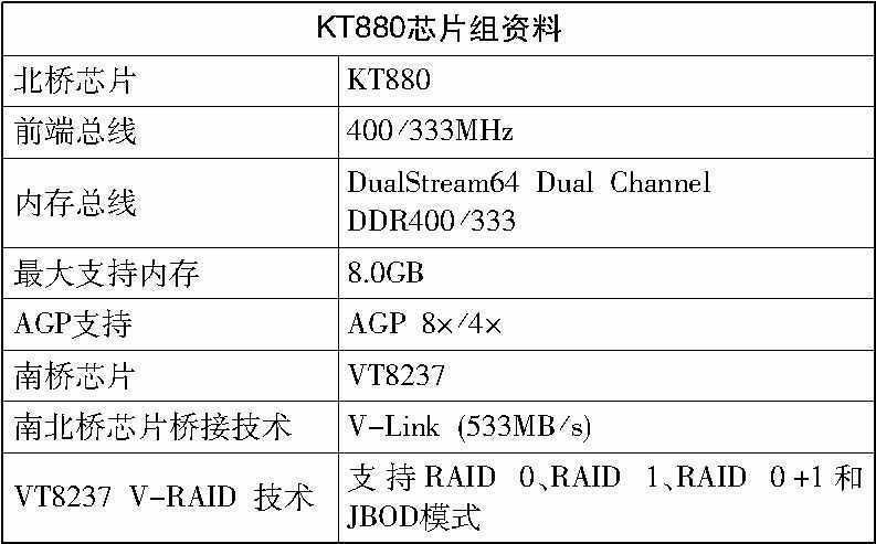 KT880产品的上市无疑给了AMD用户一个新的选择。KT880的规格和性能稍好于nForce2 Ultra400,因此完全可以满足目前中、高端AMD用户的要求,典型的高性价比搭配就是好超的AthlonXP2500+和全功能的KT880,将AthlonXP2500+外频从166MHz提升到200MHz,直接就是AthlonXP3200+的性能水平,性能和功能都会让你满意。对于低端的用户,KT880也可以轻装上阵,搭配VT8235南桥,省去千兆网卡和8声道声卡以及对SATA的支持,价格自然大幅度降低,轻装上阵的KT880搭配高频的Duron处理器一样可以给低端用户提供很好的性能。