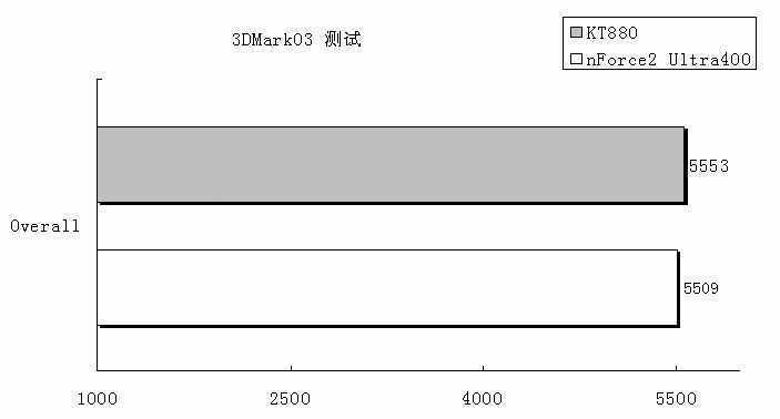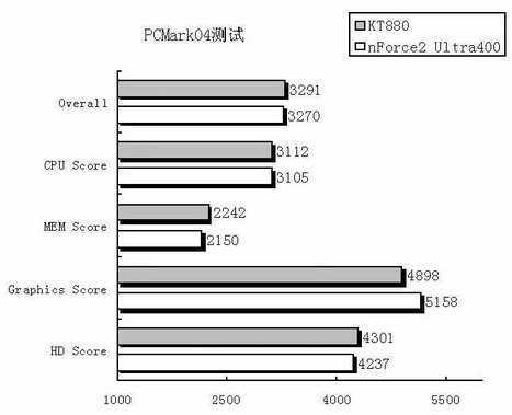在PCMark04测试里KT880总分小幅度领先nForce2 Ultra400,KT880的内存、磁盘性能都超过了nForce2 Ultra400,特别是内存性能,超过nForce2 Ultra400 大约4%。不过在显示性能上面,KT880得分落后nForce2 Ultra400大约5%,考虑到PCMark04所带的显示性能测试是主要针对AGP性能而言,所以从这个成绩来看KT880的AGP性能比nForce2 Ultra400的稍弱一点。磁盘性能方面,两者的PCMark04得分不分伯仲,差距在1%左右,完全可以忽略。