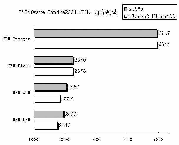 SiSoftware Sandra2004针对主板的CPU、内存、磁盘都有相应的测试项目。从得分情况来看,两者对CPU的支持都很好,得分几乎相同。内存性能方面,KT880大获全胜,同样是双通道DDR400,KT880的得分超过了nForce2 Ultra400大约12%。由于CPU前端总线是333MHz,与内存之间的极限带宽也只有2700MB/s,而KT880达到了2567MB/s,与理论值相当接近了。可见KT880的内存控制器设计得很出色。磁盘性能方面,VT8237南桥也再次领先nForce2 MCP,大概有6%的优势。这次KT880在SiSoftware Sandra2004的测试中可以说是出尽了风头。