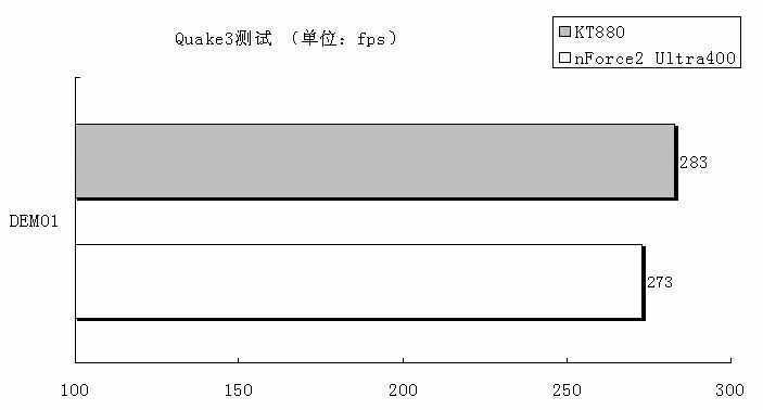 在3DMark03测试里KT880再度领先,不过这次优势很微弱,所以我们判断KT880虽然AGP性能比nForce2 Ultra400的稍弱,但是强劲的内存性能让它在最后的整体表现上反而高出了对手一点点。Quake3测试里KT880继续领先,对内存性能很敏感的Quake3当然会在内存性能更好的KT880上跑出更好的成绩,对于相同技术指标的芯片组来说,KT880能在一个游戏中性能超过nForce2 Ultra400的4%也是很难得的。