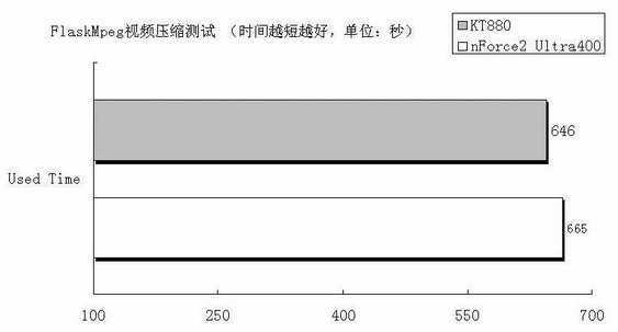 我们对KT880和nForce2 Ultra400所搭建的系统进行了视频压缩的测试,可以看到,内存性能的优劣对于Mpeg视频压缩性能的高低影响是多么明显。KT880凭借更高的实际内存带宽,在该项目测试中取得了比nForce2 Ultra400快3%的成绩──对同一个VOB文件进行Mpeg4压缩整整快了19秒。