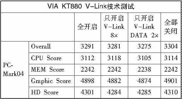 我们在KT880主板BIOS中看到了V-Link 2×DATA Support和V-Link 8×Support两个选项,因此我们决定测试在这两个项目开/关的状态下系统性能的改变情况。测试结果比较出人意料,不管是单独开启哪一项,PCMark04的测试结果都没有什么变化,相反的是,关闭这两项后,系统的PCMark04得分反而提升了。当然,这三个状态下的性能得分差距都非常小。不排除是由于主板是工程样板,BIOS设计还没有彻底完善造成的可能。