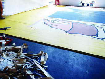 室内写真机相比室外大喷的一个优势是如果墨水使用得当也可以适当输出室外喷绘,但是写真机的幅宽一般在2m以下,因此大幅面需要后期拼接。找一个地势平整的空旷场地,首先将两幅画要拼接的一端裁齐,然后在平面上将画展平,按照正确的相对的位置把画放好,并用胶条固定(图4)。掀起上层画相接部位并喷胶(不要喷到画面),完成之后翻起下层画面的相接部分喷胶,压实即可。另外拼接好的画不可按垂直接缝卷起,这样很容易在相接处产生皱褶,切记!