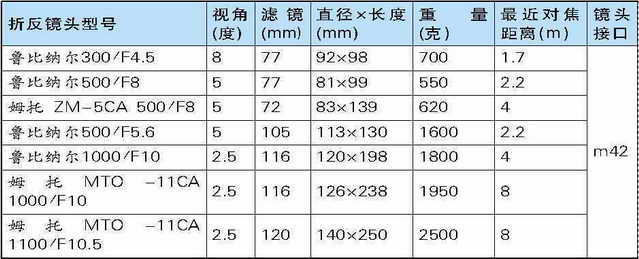许多厂家都生产折反镜头,比如佳能、尼康、宾得、腾龙、适马等厂家都有相关的产品。作为光学产品生产大国的俄罗斯在反射镜头技术方面具有较先进水平,而且品种也较为齐全,最突出优势是价格低廉。市面上比较常见的“鹅头”有300/F4.5、500/F5.6、500/F8、1000/F10等几种,其规格型号见下表: