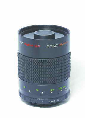 上面讲述了很多折反镜头的原理和特点,现在就让我们来实践一下折反镜头在佳能EOS 300D数码单反机上的应用吧。笔者拿到的是俄罗斯产的卢比纳尔500mm/F8的折反镜头(图2,售价1250元)和俄罗斯的2×增距镜,两者结合就可以变成了1000mm的超远摄镜头。再乘上EOS 300D的1.6的焦距系数,我们就拥有了一个相当于传统胶片135单反相机1600mm的超远摄镜头了,效力是非常惊人的。