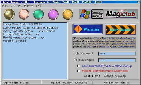 不想让别人随便动你的电脑?那就用Magic Locker(下载地址:http://www.skycn.com/soft/13659.html)给硬盘加个“锁”吧。它可用随机生成的密钥加密文件分区表,再通过密码来锁定硬盘,开机时必须正确输入密码才能继续启动。当然了,如果此时有人想用软盘或光盘启动系统,则除了一个闪动的光标,屏幕上是一团漆黑,访问硬盘就更没门了。