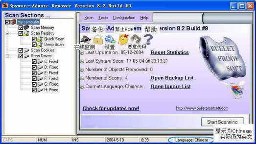 Spyware/Adware Remover 8.2(以下简称SAR 8.2)是BPS软件公司的产品。安装时首先选择使用语言,然后不断点击“Next”即可。需要说明的是,尽管其中有繁体中文选项,但用户安装后界面仍为英文,包括日文、韩文也是如此,看来SAR对亚洲用户的支持还需加强。