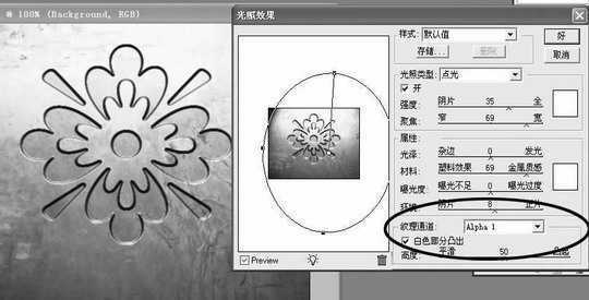 2.回到RG B通道,然后点菜单“滤镜→渲染→光照效果”,在纹理通道中选取Alpha1,去掉“白色部分凸出”选项的钩,通过预览,你可以看到刚才图案透过材质实现出很漂亮的图案效果(图2)。