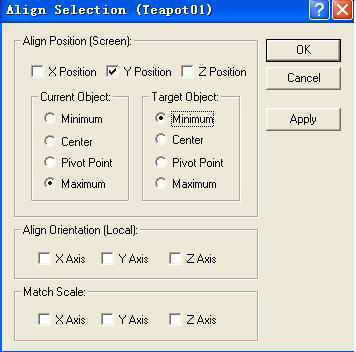 2.设置投影体。在Geometry 面板中单击“Box”,在Top视图中建立一个Length、Width分别为200、300,Height为2的长方体,然后单击“Align”,在Top视图中选择单击茶壶,在弹出窗口中的“Align Position(Screen)”项下勾选 “Y Position”,在“Current Object”项下单选“Maximum”,在“Target Object”项下选择“Minimum”,(图2)。单击“Ok”,此时,茶壶便对齐到盒子的边缘。