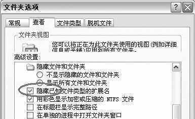 打开“资源管理器”,从“工具”菜单中选择“文件夹选项”,选择“查看”选项卡,取消 “隐藏已知文件类型的扩展名” 的默认设置,如图1所示。