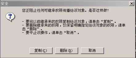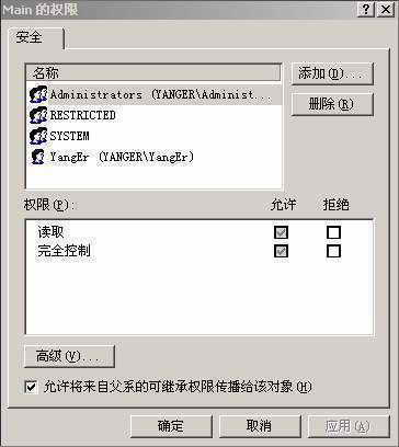 所以只要禁止修改这些项就达到了目的。我们先选中Main,然后选取菜单“安全”,点击“权限”,出现如图1所示的对话框。将最下角的“允许将来自父系的可继承权限传播给该对象”前的钩去掉。这时又出现如图2所示的对话框,选择“删除”,此时图1上面的框中将没有任何对象,我们可以添加自己的账户进去,赋予“读取”权限,也可不添加(请注意,要添加用户则只能赋予“只读”权限,否则前功尽弃)。