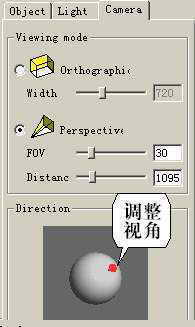 现在我们在场景中看到的是一些平面图形,需要进行视角调整才能实现三维效果。我们在主窗口左侧选择“Camera”(照相机)调出视角调整窗口,在这里选择“Perspective”(透视)选项,通过调整下面的“FOV”和“Distanc”两个选项的滑块来调节同相机焦距和距离,再在下面的“Direction”(方向)窗口里,用鼠标点住球体上的红点来调节视角方向(图2),最终得到满意的效果。