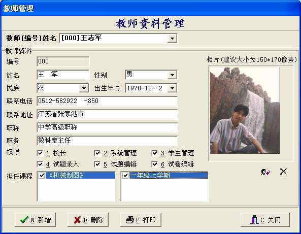 选择“师生管理→教师编辑”,进入“教师资料管理”窗口(图1),在这里可以填写使用者的详细资料,创建新用户,还能对用户的各种权限进行设置,另外,还能为每个用户设置相片(仅支持BMP格式)。
