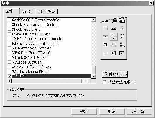 在利用农历控件进行编程之前,我们首先要将它加载到我们的VB当中。现在,打开VB6.0,单击“工程”下拉菜单下的“部件”子菜单,选择“控件”选项,接着单击“浏览”,将它添加到列表当中,最后选中它(图1)。