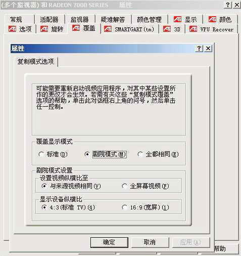 那么有没有更好的方法啦?答案是肯定的。向大家介绍一种新的方法。首先,你必须有一块ATi Radeon显卡(即“镭”卡),在显示设置的扩展页面中,点选覆盖标签(注意,其中的亮度等滑块要在播放视频时才可调),再点选“复制模式选项”,然后在“覆盖显示模式”中选择“剧院模式”;在“剧院模式设置” 页面,分别选中其中的“与来源视频相同”和“4:3(标准TV)” 两个选项(如图),确定后你就可以随心所欲地看电影了。但要注意不能将副显示设备设置为扩展桌面(如果要调整副显示设备的颜色数和分辨率参数时,则要先将它设置为扩展桌面,否则无法调整)。