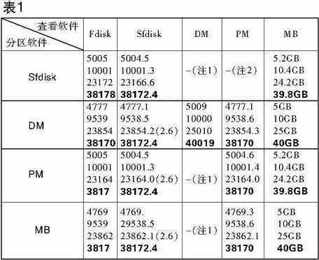 通过表1、表2,可以看出用DM一类软件(无论是万用版还是原厂的MaxBlast)查看的容量都偏大,如总容量都达到了40GB;通过表格还可以看出使用DM一类软件(不管是万用版还是原厂提供的)和其他第三方厂商提供的工具对硬盘进行分区,虽然输入的分区大小是相同的,但在Windows系统下显示的容量却并不相同,DM一类软件分区后容量会小于当时设定的值。这主要是计算方法不同所产生的结果。Sfdisk这款软件比较特殊,它显示的硬盘容量要比其他软件多出2MB多(不考虑硬盘厂商的换算关系),而且用其他软件分区在它这里总是显示出2.6MB的未使用空间(括号中标注的)。