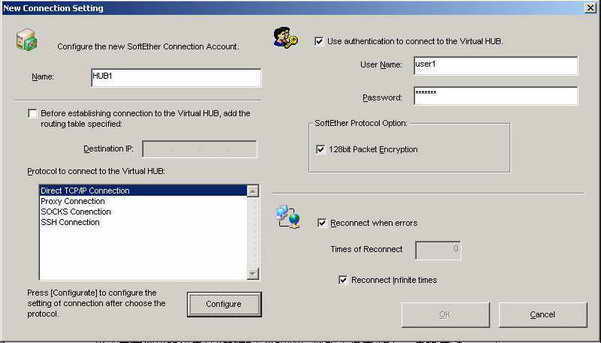 依次打开“Account”菜单中的“New Account”,新建一个连接(图2)。“Name”一项填上“Hub1”,然后选中“Use authentication to connect to the Virtual Hub”,并输入用户名“USER1”和密码。紧接着选中“Direct TCP/IP Connection”协议,并单击“Configure”进行设置。“Address”一项填入本机IP地址:127.0.0.1,Port为默认。