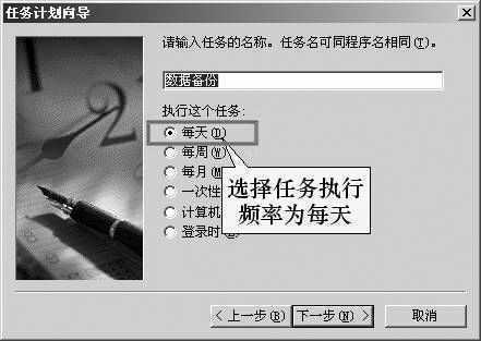 依次点击“开始→设置→控制面板”,进入“任务计划”文件夹,双击“添加新任务”,在弹出的“任务计划向导”中先将创建的数据备份快捷方式添加至任务列表中,然后选择执行任务的频率为“每天”(图2),在下一步中为该任务指定运行的时刻(果冻为下午6点下班,所以任务执行时间选定在17:50),最后输入系统的用户名和密码即可。