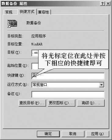 现在,备份任务的建立就算大功告成了。不过,果冻决定再耍一个“花招”来唬唬草莓这帮菜鸟:实现一键备份。将数据备份的快捷方式拷贝到桌面上,然后右键点击该快捷方式,在弹出的“属性”框中选择“快捷方式”选项卡(图3),再在“快捷键”栏中指定快捷键(如F9),以后只要按下F9键就能够激活备份操作了。