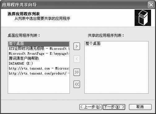 首先使用客户端登录到服务器,单击我们要邀请共享的在线用户,在弹出的菜单中选择“应用程序共享”进入“应用程序共享向导”窗口,点击“下一步”按钮进入“选择应用程序列表”对话框(见图),在这里可以将本机上开启的应用程序共享给其他人。如果要邀请别人共享你的桌面则应在“桌面应用程序列表”框中选中“整个桌面”,然后点击“>”按钮把“整个桌面”放置到“共享的应用程序列表”框中。