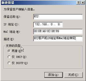 在DHCP服务器端,打开DHCP管理器,展开笔者创建的范围为“192.168.0.5~192.168.0.123”的作用域,右键点击“保留”选项,在弹出的菜单中选择“新建保留”,弹出配置对话框。在该配置对话框中为主机名为“RTJ”的客户机绑定IP地址和MAC地址(见图),在“保留名称”栏中为该保留项目取名,如“RTJ”,然后在“IP地址”栏中输入“192.168.0.8”,“MAC地址”栏中输入客户机的网卡MAC地址“00-0E-A6-0C-DE-B9”,接着在“支持类型”中选择“两者”选项,最后点击“添加”按钮,即可完成客户机的IP地址和MAC地址绑定。