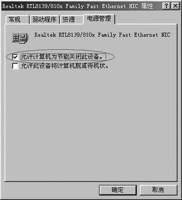 难道是网卡坏了?这可麻烦了,笔者的网卡是集成的,无法进行替换测试。真的要再加一块新网卡吗?这可使囊中羞涩的笔者心有不甘。“硬”的不行再来“软”的,笔者又打开了“设备管理器”,查看网卡属性,在“常规”、“资源”选项卡中没有发现有任何设备冲突的现象。不过笔者在“电源管理”选项卡中,发现“允许计算机为节能关闭此设备”项被勾选了(见图),笔者恍然大悟,原来此次故障是由“节能”造成的,取消对此项的勾选后,故障便得到了解决。
