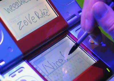 相比于PSP强大且多元化的功能组合,NDS虽然也拥有无线通讯功能,但总体来说它还是属于一款游戏主机的范畴。无论是上下分屏还是触摸屏的设计都是为玩游戏服务的。任天堂希望依靠着上下分屏可以创造与以前有着截然不同理念的新游戏,但是在本届E3展出的游戏软件还没有一款能够较好地发挥双屏这一特性。反倒是下方那个触摸屏带来了许多新的乐趣,用触摸笔把宠物小精灵或者马里奥大叔的鼻子或者耳朵拉长,或者即兴画一张小画、写几句问候的话传给附近的另外一台NDS。