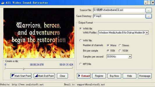 软件亮点:可从AVI、Divx、MPEG、WMV、ASF等格式的视频文件中撷取声音并存为WMA、MP3、WAV等格式的音频文件。