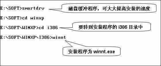 在第二种情况下,启动后需要手工运行在硬盘或光盘中的安装程序。在安装之前千万不要忘记运行“smartdrv.exe”磁盘缓冲程序,否则第一个复制文件的步骤就要二个小时以上。Windows XP的安装执行文件一般为“winnt.exe”,在安装光盘或安装文件的i386目录下,你可在DOS提示符下键入类似“E:\soft\winxp\I386\winnt”命令,也可用“cd”命令,转到i386所在的目录,运行“winnt”命令(图1),即可运行Windows XP的安装程序。这种安装方式会多一个复制文件的步骤,其余和第一种情况是一样的。