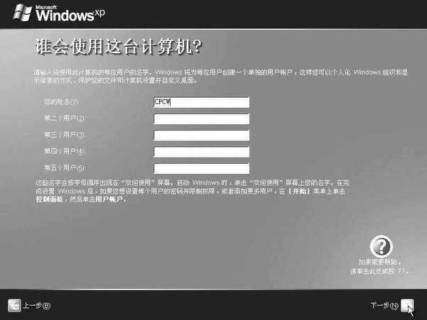 这一次的重启是真正运行Windows XP了。不过第一次运行Windows XP时还会要求你设置Internet和用户,并进行软件激活。Windows XP至少需要设置一个用户账户,你可在“谁会使用这台计算机”步骤(图9)中输入用户名称就行了,中文英文均可。