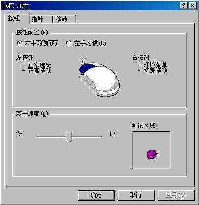 在课堂上有的同学反映鼠标不能正常使用,如左键单击出现快捷菜单,双击印程序图标电脑毫无反应等。先打开“鼠标属性”对话框(如图),查看鼠标设置是不是右手使用,双击速度是不是中速,必要的情况下可以通过测试区测试一下鼠标的双击速度。