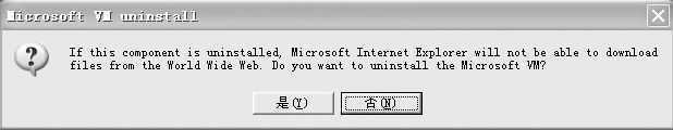 以卸载Windows XP中已安装的MSJVM虚拟机为例。点击“开始→运行”,在运行对话框中输入“RunDll32 advpack.dll,LaunchINFSection java.inf,UnInstall”命令,确定后弹出“Microsoft VM uninstall”对话框(见图),点击“是”按钮后,开始卸载Java虚拟机组件,完成后重新启动系统。