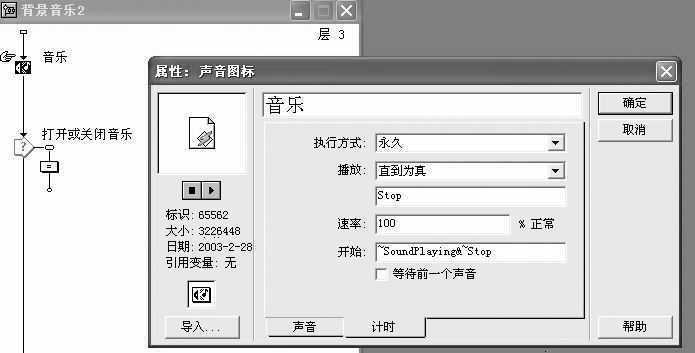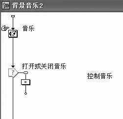 2.在AU流程线上拖入一声音图标并加载一背景音乐。在声音图标中进行如下设置:执行方式为永久;播放为直到为真,用变量Stop的值由假改为真时使声音停止播放;开始中用~Soundplaying&~Stop的值由假改为真时使声音播放(图1)。