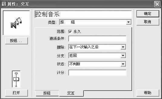 4.向交互图标中拖入一计算图标,交互方式为按钮,命名为控制音乐。双击按钮响应方式图标,调出交互属性对话框,对其中的交互标签设置如图:范围为永久;分支为返回(图2)。