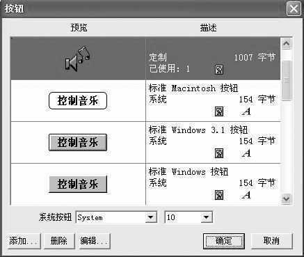 5.加载自己的按钮:双击按钮响应方式图标,调出交互属性对话框,单击该对话框内的“按钮…”按钮,调出按钮对话框,如图3所示,利用它载自己制作的两喇叭及停止,制作一个自己的按钮。