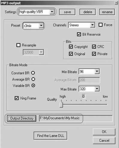其中,setttings选项选为high quality VBR,Preset选为r3mix,再选择一下输出路径,点击确定两次(第二次为确认保存设置),好啦,恭喜你!现在你的Winamp也可以完成音乐格式转换了!