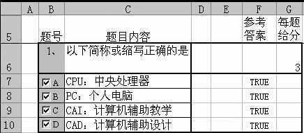 同理,在B8~B10单元格中插入复选框B、C、D,再分别链接到F8~F10单元格。输入本题的正确答案,对应的F7~F10单元格会自动填入TRUE。