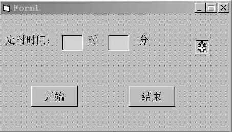 首先运行VB,新建一个EXE工程,在Form上添加三个Label控件,命名为“定时时间:”、“时”和“分”;然后在三个Label控件之间添加两个TextBox控件,一个用来输入小时,另一个用来输入分钟;再添加两个Command控件,命名为“开始”和“结束”;最后添加一个Timer控件,它的Interval属性设置为3000(播放提示音的时间间隔为3秒)。整个界面如图所示。