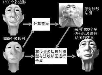法线贴图的意义不仅在于实时生成新的有光影变换的贴图,更重要的是在游戏制作中,法线贴图提供了一个“取巧”的办法,可以使用较少的多边形运算来尽可能逼真地表现物体细部。比如,对一个游戏中的人物角色,可以为它建两个模型,一个使用了大量的多边形,用尽可能多的多边形来捕捉它所有的细微表现。另一个仅使用少量多边形,只要有足够能力来捕捉人物的整体形状即可。然后我们以第一个使用大量的多边形的人物模型为基础,建立法线贴图。而在实际游戏中,我们使用的是第二个少量多边形的模型,只不过我们在其表面使用了大量多边形的模型生成的法线贴图,这样就达到了以尽可能小的代价,描绘尽可能多的细节的目的。有时候为了进一步刻画模型局部细节,还要在模型某些重要局部使用分辨率极高的普通贴图,最终一个逼真的游戏人物就诞生了。如今这种方法已经被大量利用到顶尖的3D游戏中来,比如Half-life2、Doom3、Far Cry等都利用了它。