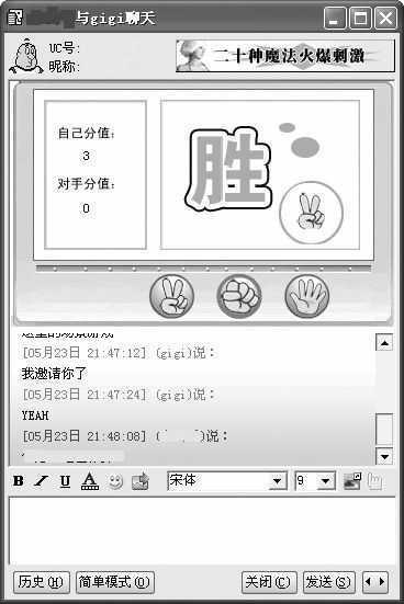 2.选择一款大家玩过的石头、剪刀、布小游戏吧,这样会勾起MM对幸福童年时代的回忆。选择这款游戏向MM发出邀请,只要对方接受后便可以进行游戏了(图3)。游戏简单好玩,并且可以在对话框中即时与MM进行对话沟通。在此郑重提示一下:千万别赢MM太多,最好多输几次,否则想想后果吧……