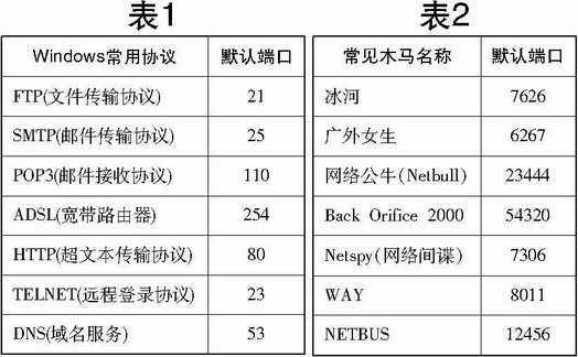 我们可以通过查看程序监听的端口来进行判断,下面列表中所举为Windows常用协议默认使用的端口(表1)和几种流行木马使用的端口(表2)。查看端口的方法一般有两种(以前电脑报介绍过多次,在此只做简单描述):