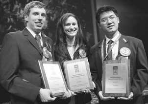 ISEF大奖的三位得主。朱元晨(右一),此项大奖的另外两名获得者是来自美国佛罗里达州的Sarah Rose Langberg和来自德国格雷芬海尼兴县的Uwe Treske。